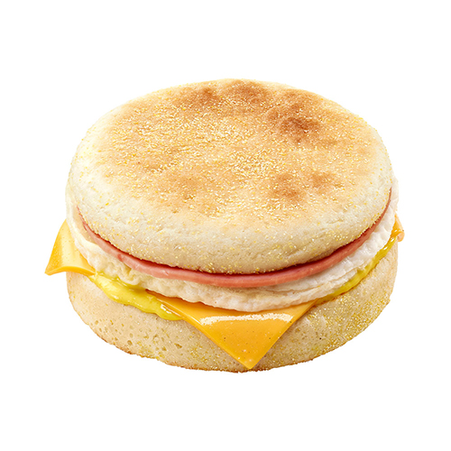 폭신한 잉글리쉬 머핀에 달걀, 햄, 치즈, 그리고 홀머스터드가 발라진 영국식 아침 식사 대용 제품